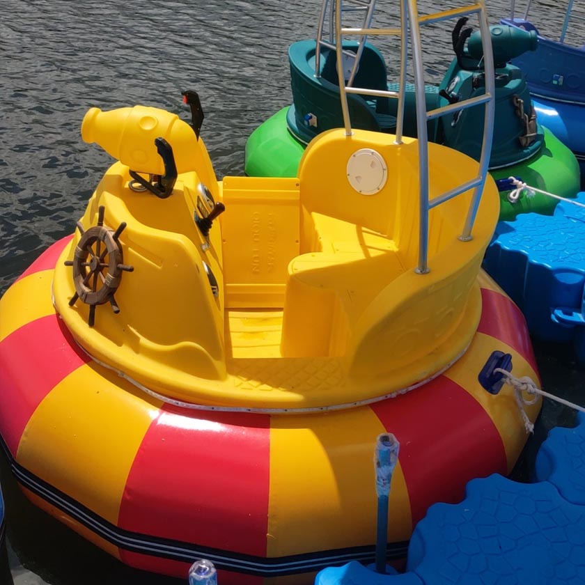 The laser Bumper Boat is a high-tech water amusement equipment with beautiful appearance, excellent performance and strong sense of participation. The PVC mesh cloth outer tire makes the collision more exciting and safer. It is accompanied by a high-fidelity sound system and changeable lights while traveling. Making it more interesting, the intelligent motor control system can better protect the motor and extend battery life. Visitors can drive the warship forward, backward, left and right through the steering wheel. There are laser guns on the ship. Visitors can shoot at each other. When one party is hit by the other, water will spray out from various locations on the hull. At the same time, you can also shoot the mines set on the water. When the gun hits the mine, the mine will emit a fountain more than three meters high and make an explosion sound.