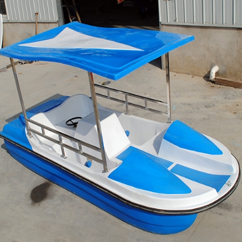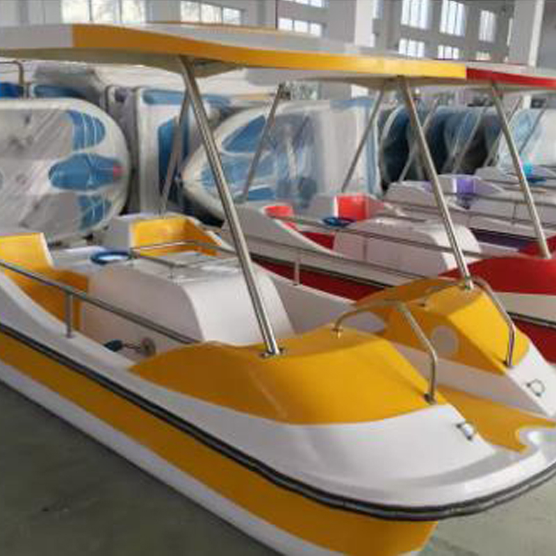 Fiberglass pedal boats have a hollow hull. The hull is generally light in weight and can float on the water. Early boats were generally made of wood. There were wheels with paddle boards on both sides or at the stern of the boat. The wheels were powered by human power. Turn. The paddle moves the water backward to move the boat forward.
